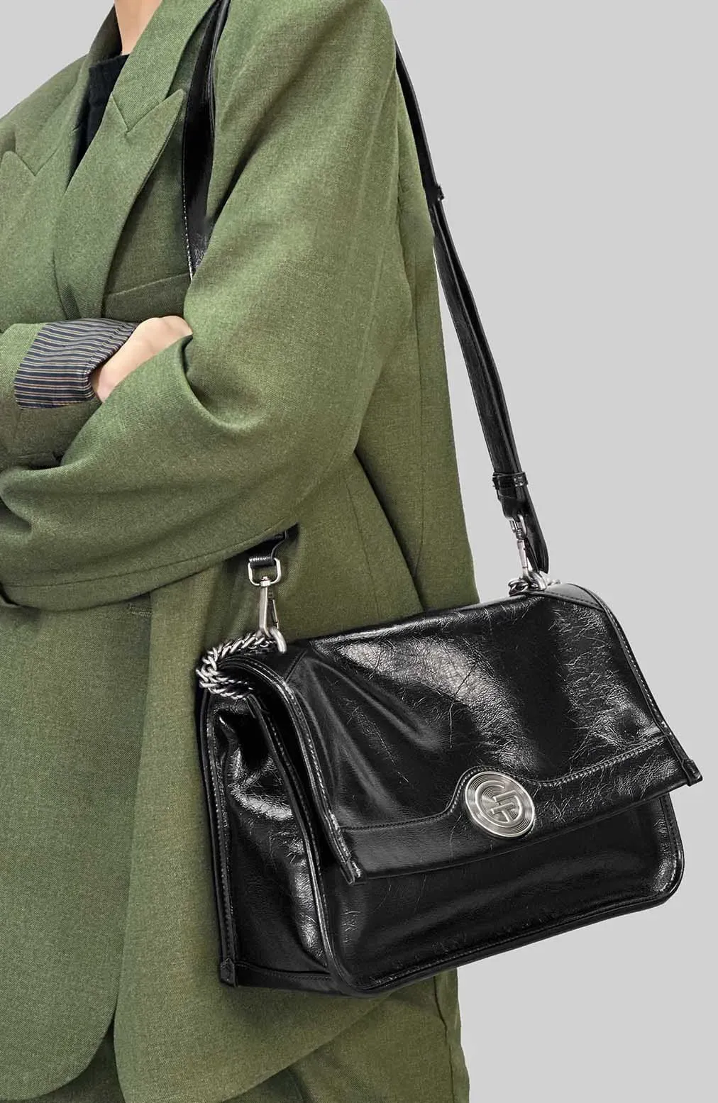 訂製的復古做舊真空電鍍五金,色澤亮麗,造型簡潔大氣,耐磨防脫色更顯質感與美感;可拆卸肩帶、鏈條,配備可拆卸皮質肩帶、鏈條,背法多元化,肩帶可供單肩和斜挎,鏈條可供手提和腋下背。