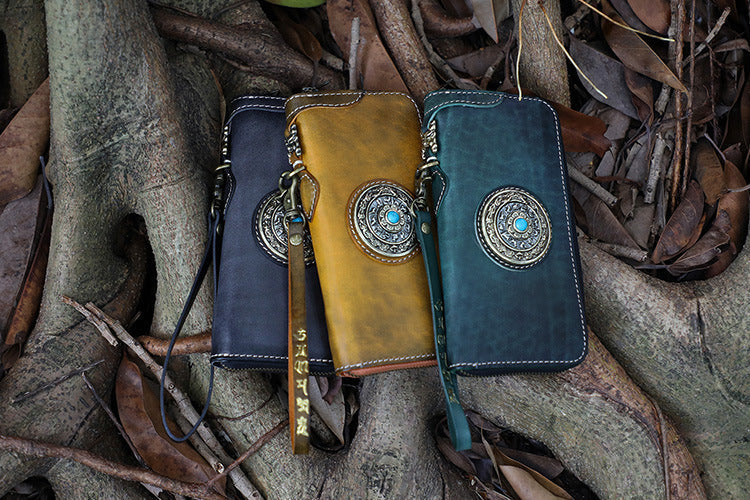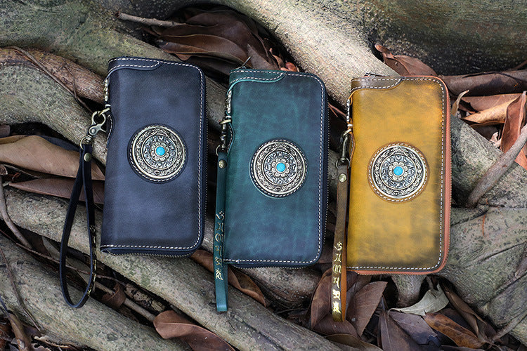 Handmade Green Leather Tibetan Totem Long Wallet Cool Zipper Clutch Wristlet Wallet for Men – 宇宙皮號