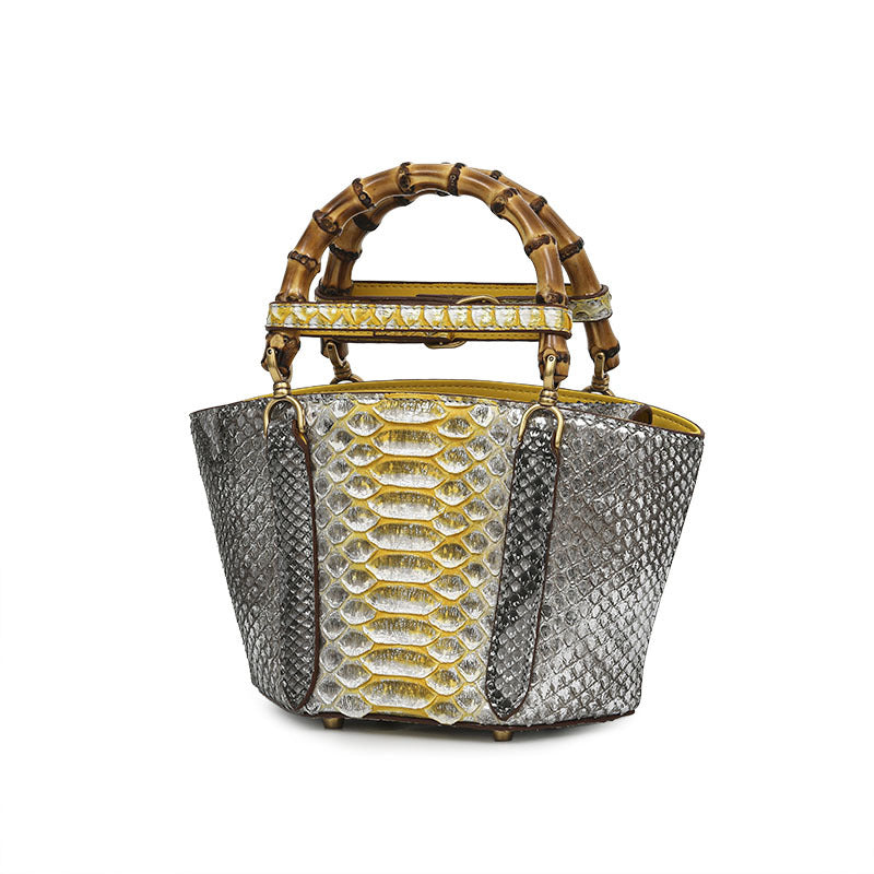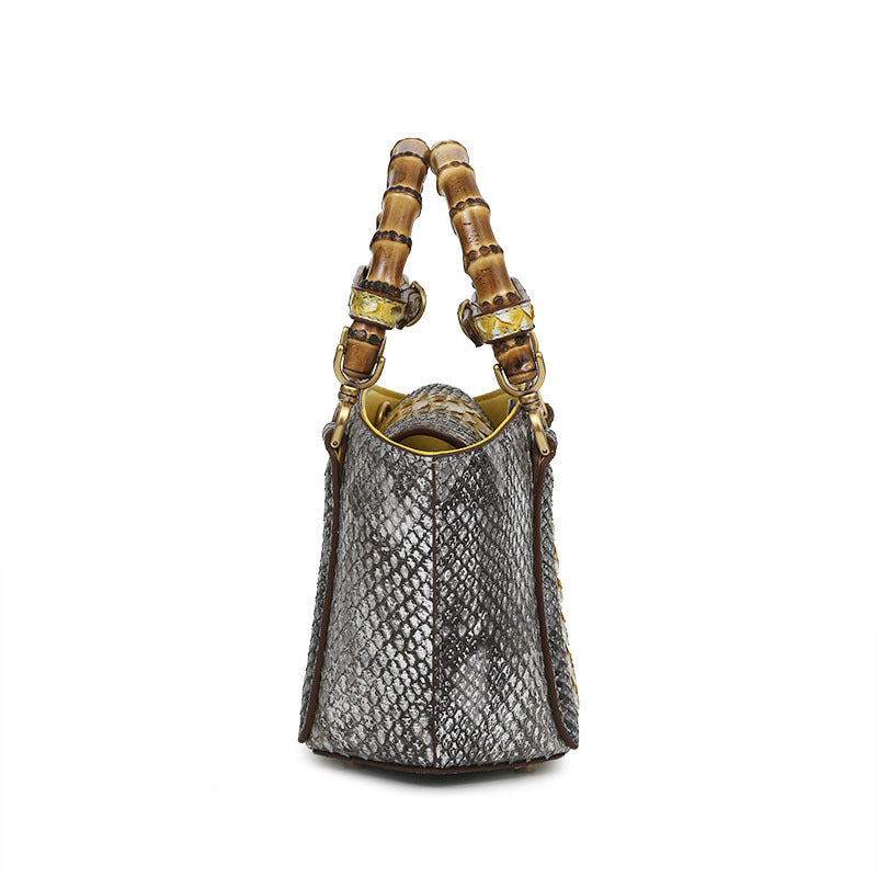 Snakeskin, bags trend style small square bag, popular elements of color, snake print, bamboo. The lining texture is microfiber. Flap closure. Medium-soft hardness.