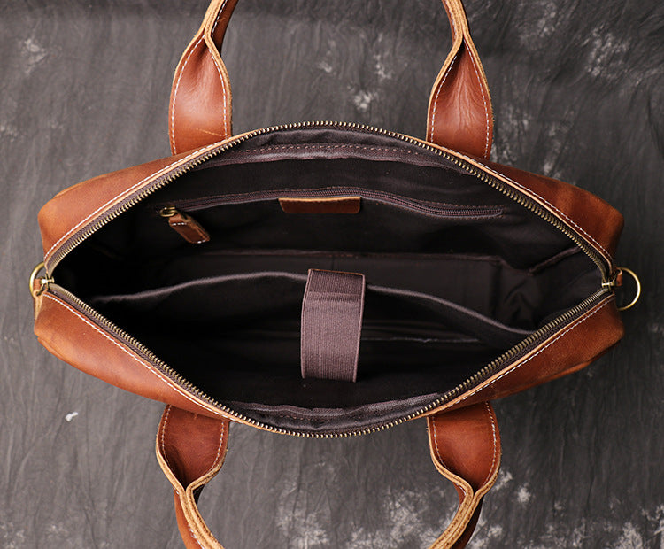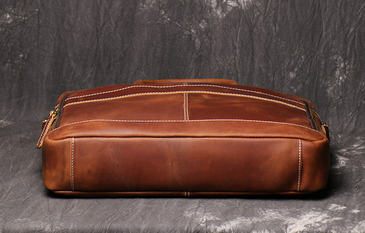 🟠Structure for this brown leather messenger bags for mens: 1* main pocket, 1* front zippee handle of your pocket (a multi-functional storage area for A4 papers, pens, cards, key, phone, ect.), 1* inner zipper pocket, 1* 14 inch padded laptop compartment. Also with a belt backside attach to travel luggage,free your hands,very convenient.