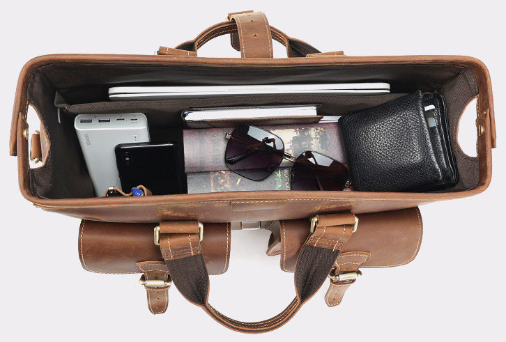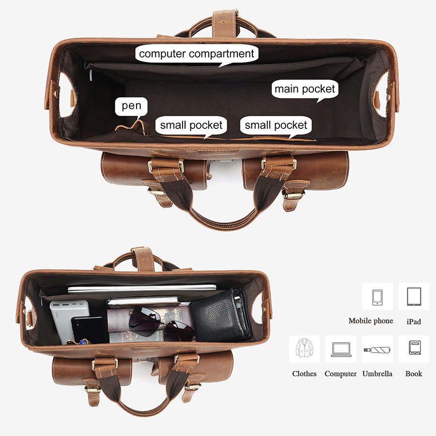Ingenuity and craftsmanship. Pay tribute to the opening and closing design of the doctor bag, practical hinged clip opening and closing, with hardware padlock, selected high-quality Oil Impregnated Leathers, the texture is grand and rough, good leather determines good quality.