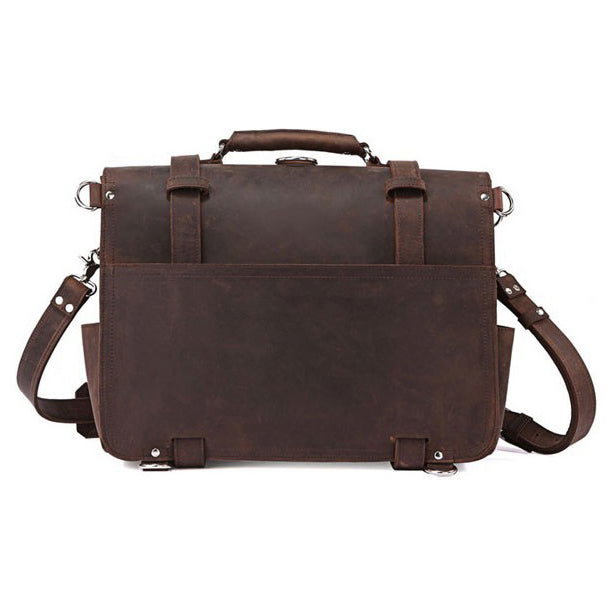 With its dual locking flaps, this leather messenger bag secures and protects your items, yet also has ample room to store all your gear. Made from luxurious vintage fllgrain leather, this briefcase laptop bag is perfect for the daily commute or a business trip. Created with durable, extra-thick, stylish leather and with a comfortable, removable shoulder strap, you'll know it's built to last.